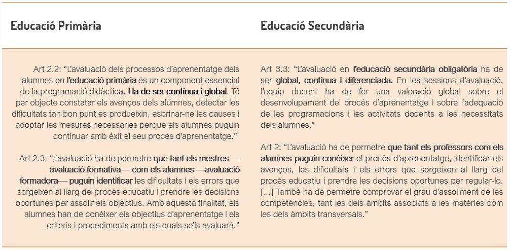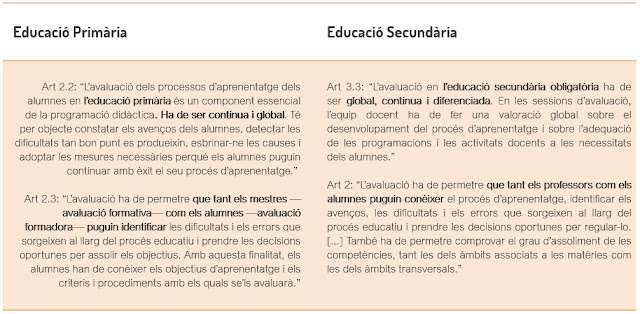 L’avaluació, perquè sigui global i continuada, ha de facilitar, tant a docents com a alumnes, la identificació dels obstacles que dificulten l’aprenentatge, la millora del seguiment del procés d’ensenyament-aprenentatge i la despenalització de l’error, i ha de potenciar la progressiva autoregulació dels aprenentatges per part de l’alumnat.